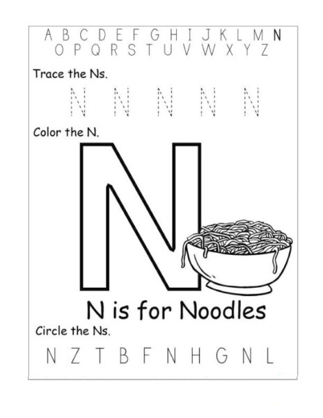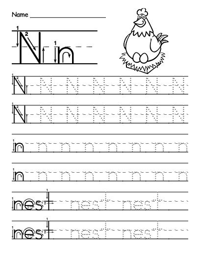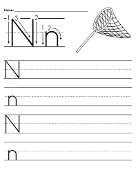 Download Printable N sound handwriting alphabet Letter N Worksheets with lower and upper case practice for children.